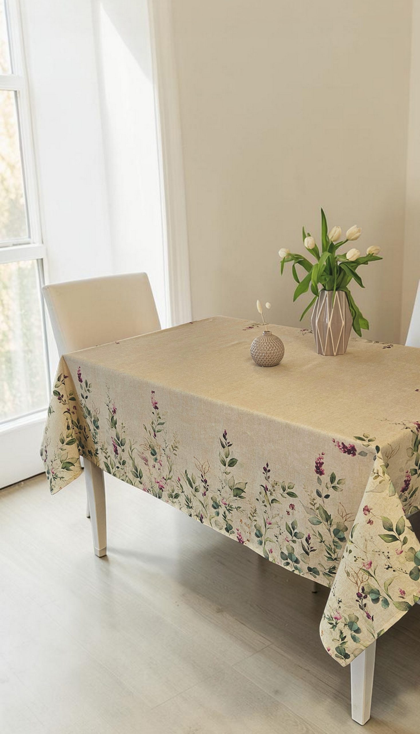 Tραπεζομάντηλο τυπωμένο με ανεξίτηλα χρώματα. Διαθέσιμο σε τρεις διαστάσεις: (140x140cm, 140x180cm, 140x220cm), καρέ (93x93cm) και τραβέρσα (45x140cm). Η σύνθεσή του είναι από 80% βαμβάκι και 20% πολυέστερ. Πλυντήριο στους 30 βαθμούς, σιδέρωμα σε μεσαία θερμοκρασία.